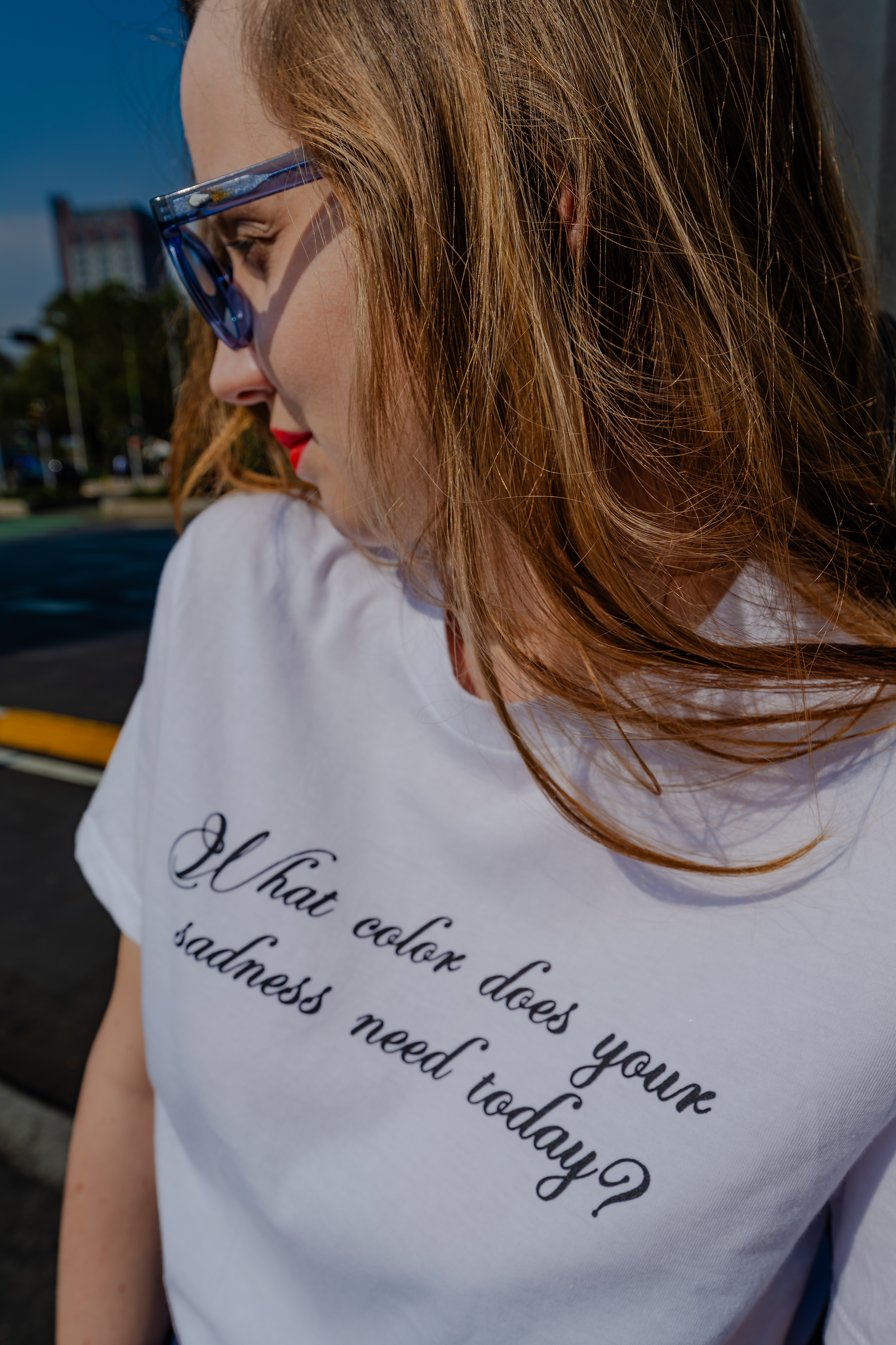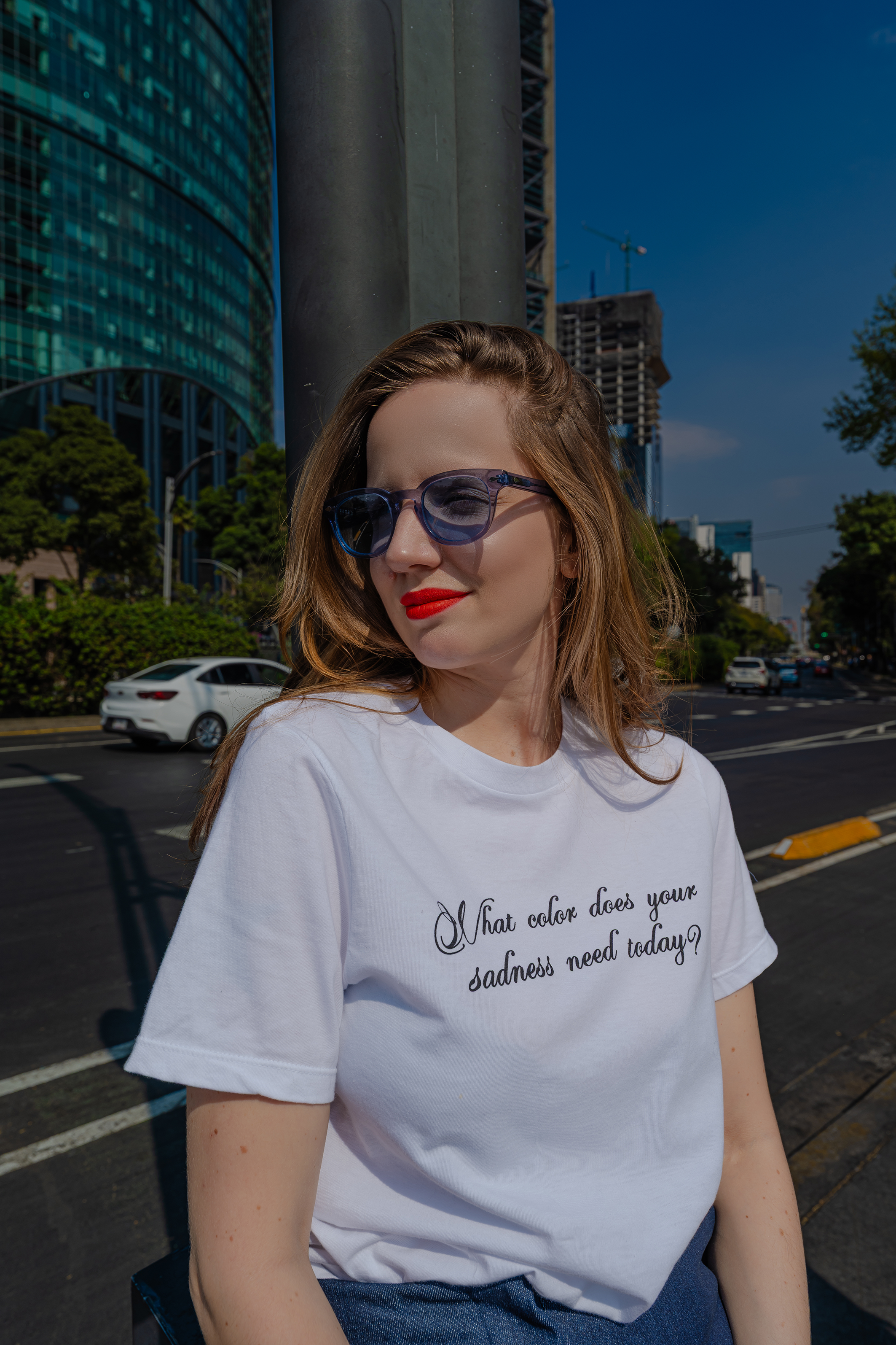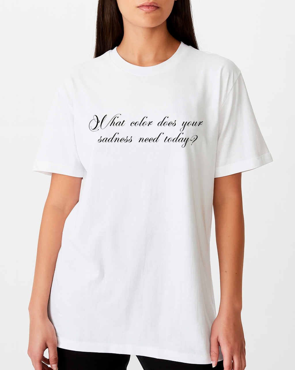 ¿De qué color necesita tu tristeza hoy? nace del relato de Nomino — una pregunta que ella formula en su camino de escucha del dolor y de su transformación a través del color. Impresa en tipografía elegante, la frase se convierte en un recordatorio sutil de encontrarnos con la tristeza desde la ternura y la elección.